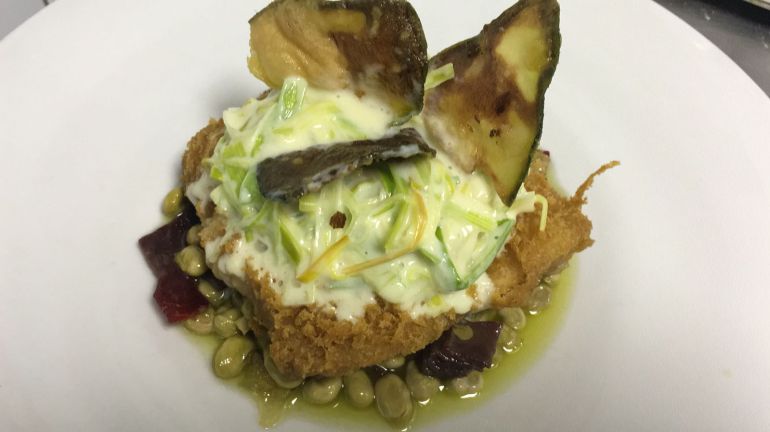 Bacalao en tempura de miel sobre habitas salteadas con cecina y puerro a la crema